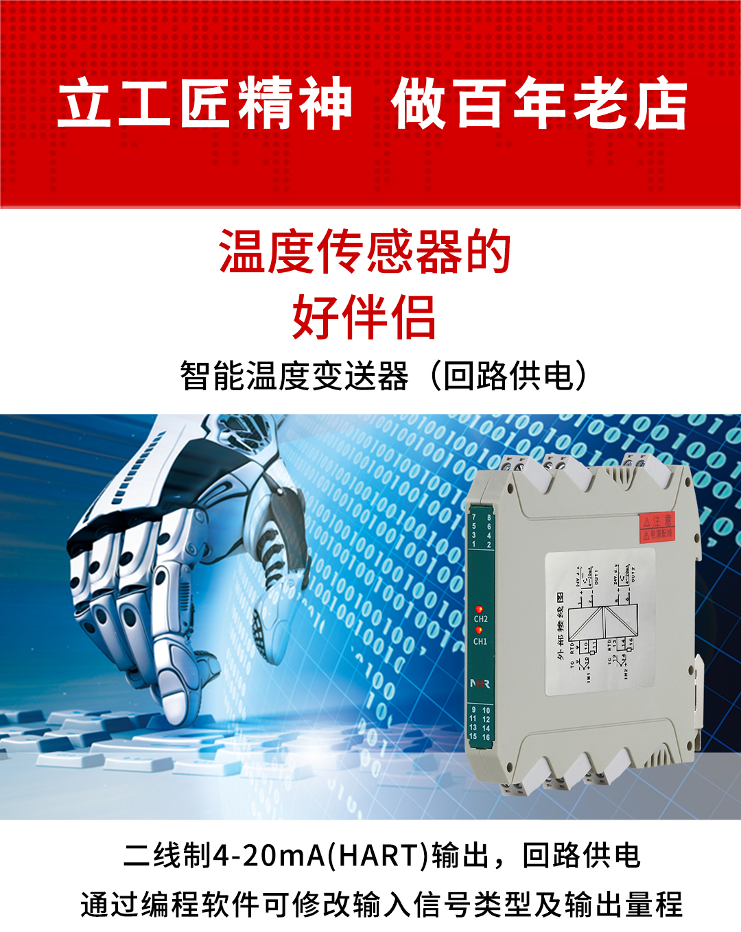 虹潤(rùn)公司是專業(yè)生產(chǎn)溫度變送器的國(guó)家專精特新“小巨人”企業(yè)。生產(chǎn)的HART智能溫度變送器,具有適配各類溫度傳感器,通過編程線修改輸入信號(hào)類型及量程,二線制4-20Ma(HART)輸出,回路供電等特點(diǎn)。該產(chǎn)品不僅通過HART基金會(huì)認(rèn)證、德國(guó)萊茵 CE 認(rèn)證與 SIL 功能安全認(rèn)證,還獲得具備減震抗干擾能力的溫度變送器、信號(hào)隔離器、一種二端子模塊、無源信號(hào)隔離器等4項(xiàng)國(guó)家發(fā)明專利,主持起草物聯(lián)網(wǎng)智能溫度儀表、現(xiàn)場(chǎng)設(shè)備工具(FDT)接口規(guī)范、工業(yè)過程測(cè)量和控制系統(tǒng)用溫度變送器等3項(xiàng)國(guó)家標(biāo)準(zhǔn),以及通信系統(tǒng)多通道數(shù)據(jù)采集控制終端規(guī)范軍用標(biāo)準(zhǔn),參與國(guó)際5G標(biāo)準(zhǔn)制定,取得HART溫度變送器、智能溫度變送器等5項(xiàng)相關(guān)軟件著作權(quán)。產(chǎn)品廣泛應(yīng)用于石油、化工、電力、冶金、制藥、食品、水處理等各種工業(yè)領(lǐng)域。